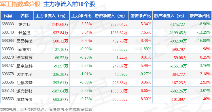 资金流向方面,军工指数(399959)成份股当日主力资金净流出合计16.79亿元,游资资金净流入合计5.12亿元,散户资金净流入合计11.67亿元。成份股资金流向详情见下表: