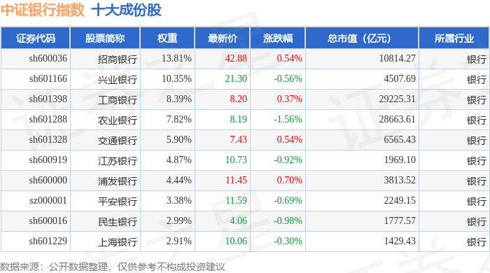 证券之星消息,11月18日,中证银行(399986)指数报收于7739.47点,跌0.34%,成交233.65亿元,换手率0.24%。当日该指数成份股中,上涨的有6家,浦发银行以0.7%的涨幅领涨,下跌的有35家,渝农商行以2.34%的跌幅领跌。