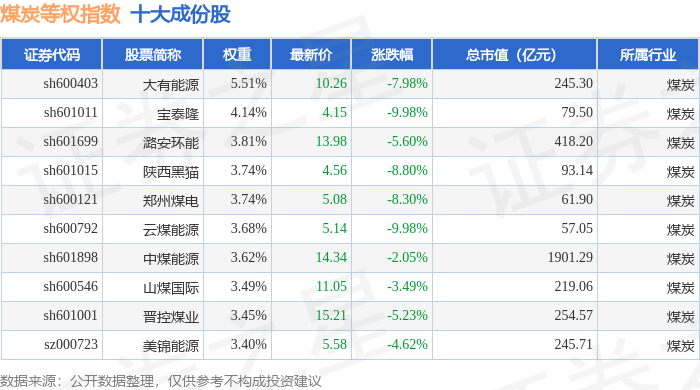 证券之星消息,11月18日,煤炭等权(399990)指数报收于3308.07点,跌4.92%,成交145.46亿元,换手率1.96%。当日该指数成份股中,下跌的有30家,云煤能源以9.98%的跌幅领跌。