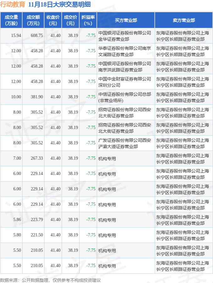 证券之星消息,11月18日行动教育发生大宗交易,交易数据如下: