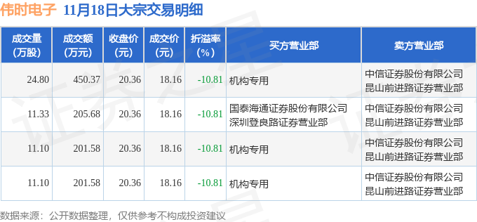 证券之星消息,11月18日伟时电子发生大宗交易,交易数据如下: