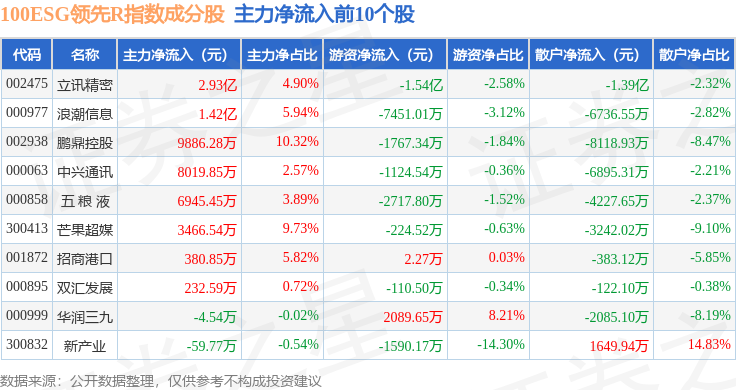 资金流向方面,100ESG领先R(470030)指数成份股当日主力资金净流出合计100.81亿元,游资资金净流入合计33.27亿元,散户资金净流入合计67.54亿元。成份股资金流向详情见下表: