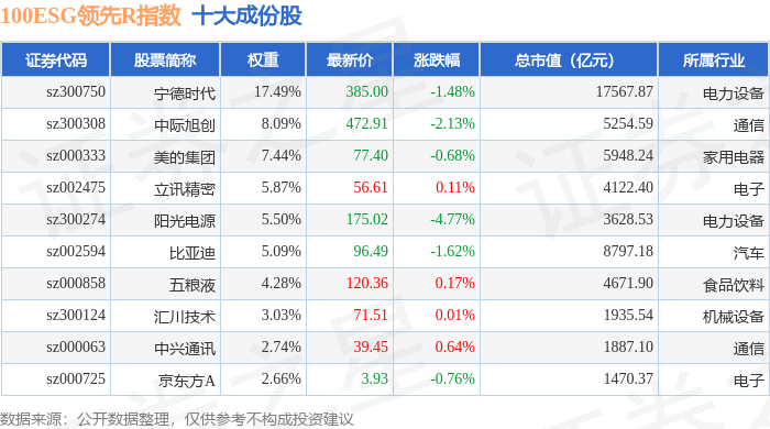 证券之星消息,11月18日,100ESG领先R(470030)指数报收于9061.75点,跌1.19%,成交1117.09亿元,换手率0.95%。当日该指数成份股中,上涨的有16家,浪潮信息以1.71%的涨幅领涨,下跌的有33家,亿纬锂能以5.81%的跌幅领跌。