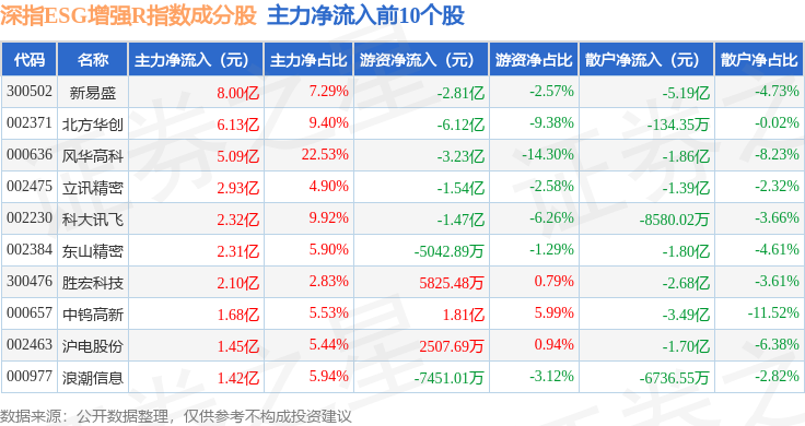 资金流向方面,深指ESG增强R(470032)指数成份股当日主力资金净流出合计109.08亿元,游资资金净流入合计26.04亿元,散户资金净流入合计83.03亿元。成份股资金流向详情见下表: