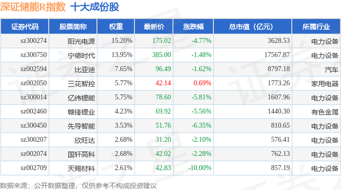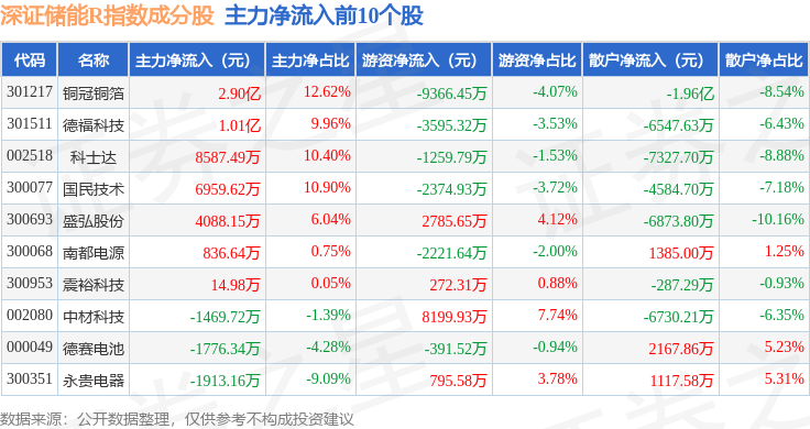 资金流向方面,深证储能R(470036)指数成份股当日主力资金净流出合计175.13亿元,游资资金净流入合计46.37亿元,散户资金净流入合计128.76亿元。成份股资金流向详情见下表: