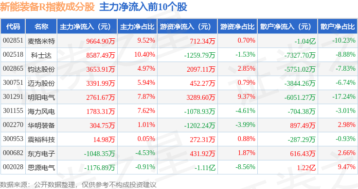资金流向方面,新能装备R(470043)指数成份股当日主力资金净流出合计146.1亿元,游资资金净流入合计39.64亿元,散户资金净流入合计106.47亿元。成份股资金流向详情见下表: