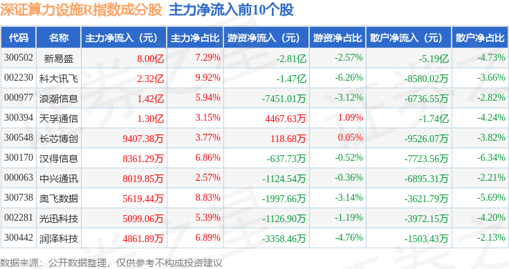 资金流向方面,深证算力设施R(470051)指数成份股当日主力资金净流出合计7.91亿元,游资资金净流入合计5.16亿元,散户资金净流入合计2.75亿元。成份股资金流向详情见下表: