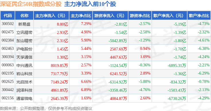 资金流向方面,深证民企50R(470057)指数成份股当日主力资金净流出合计64.32亿元,游资资金净流入合计21.74亿元,散户资金净流入合计42.58亿元。成份股资金流向详情见下表: