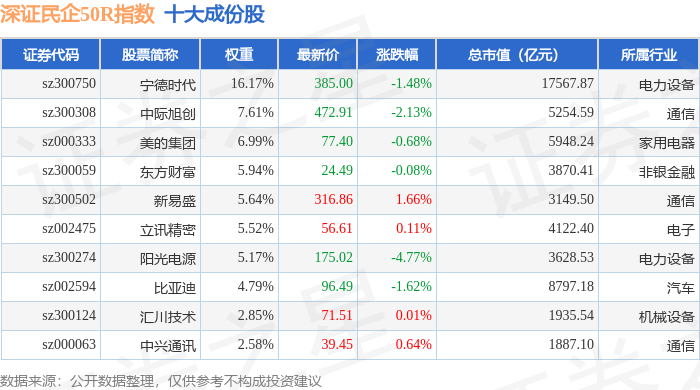 证券之星消息,11月18日,深证民企50R(470057)指数报收于3808.13点,跌0.81%,成交1185.8亿元,换手率1.47%。当日该指数成份股中,上涨的有19家,东山精密以2.84%的涨幅领涨,下跌的有29家,亿纬锂能以5.81%的跌幅领跌。
