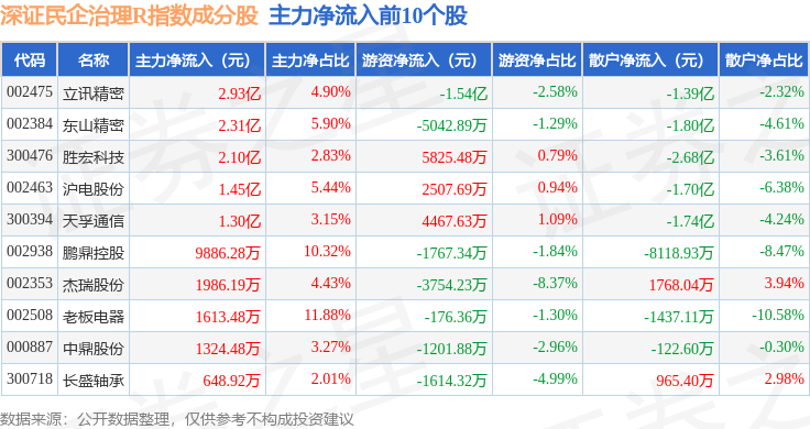 资金流向方面,深证民企治理R(470058)指数成份股当日主力资金净流出合计55.1亿元,游资资金净流入合计19.47亿元,散户资金净流入合计35.63亿元。成份股资金流向详情见下表: