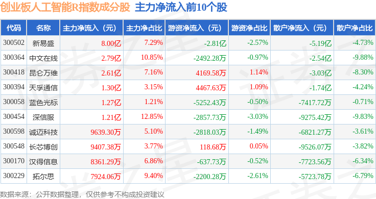 资金流向方面,创业板人工智能R(470070)指数成份股当日主力资金净流入合计15.27亿元,游资资金净流入合计1381.94万元,散户资金净流出合计15.4亿元。成份股资金流向详情见下表: