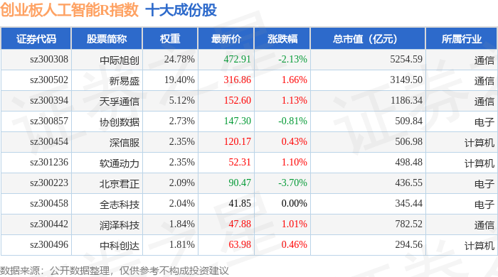 创业板人工智能R(470070)指数十大成份股详情如下: