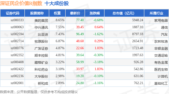 资金流向方面,深证民企价值R(470072)指数成份股当日主力资金净流出合计33.81亿元,游资资金净流入合计8.16亿元,散户资金净流入合计25.65亿元。成份股资金流向详情见下表: