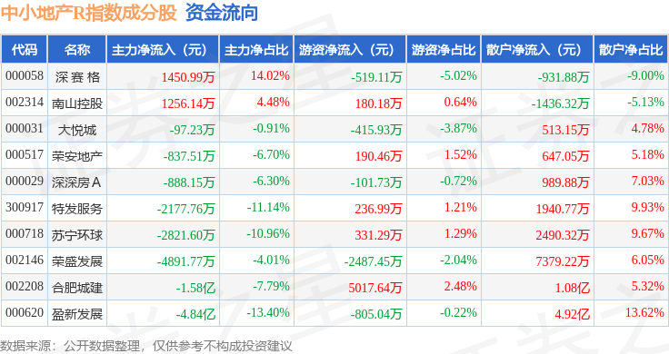 资金流向方面,中小地产R(471002)指数成份股当日主力资金净流出合计7.32亿元,游资资金净流入合计1627.3万元,散户资金净流入合计7.16亿元。成份股资金流向详情见下表: