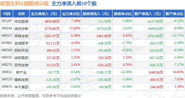 资金流向方面,疫苗生科R(480015)指数成份股当日主力资金净流出合计21.12亿元,游资资金净流入合计5.5亿元,散户资金净流入合计15.62亿元。成份股资金流向详情见下表: