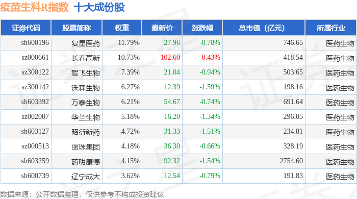 疫苗生科R(480015)指数十大成份股详情如下: