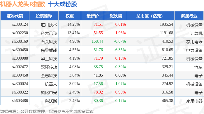 资金流向方面,机器人龙头R(480071)指数成份股当日主力资金净流出合计13.97亿元,游资资金净流入合计3.59亿元,散户资金净流入合计10.39亿元。成份股资金流向详情见下表: