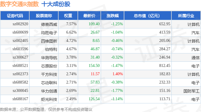 证券之星消息,11月18日,数字交通R(480075)指数报收于3268.83点,跌0.72%,成交228.95亿元,换手率1.84%。当日该指数成份股中,上涨的有15家,诚迈科技以7.16%的涨幅领涨,下跌的有33家,航天智装以6.82%的跌幅领跌。