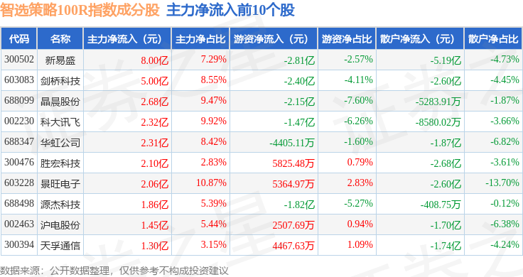 资金流向方面,智选策略100R(489015)指数成份股当日主力资金净流出合计6.42亿元,游资资金净流入合计1.77亿元,散户资金净流入合计4.64亿元。成份股资金流向详情见下表: