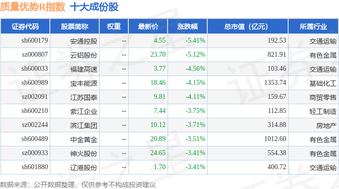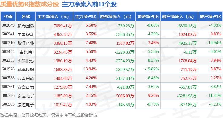 资金流向方面,质量优势R(489017)指数成份股当日主力资金净流出合计40.33亿元,游资资金净流入合计1.52亿元,散户资金净流入合计38.8亿元。成份股资金流向详情见下表: