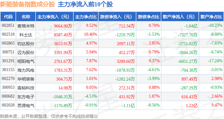 资金流向方面,新能装备(970043)指数成份股当日主力资金净流出合计146.1亿元,游资资金净流入合计39.64亿元,散户资金净流入合计106.47亿元。成份股资金流向详情见下表: