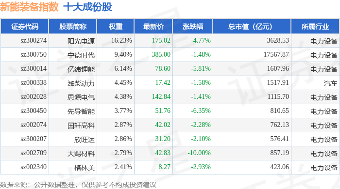 新能装备(970043)指数十大成份股详情如下: