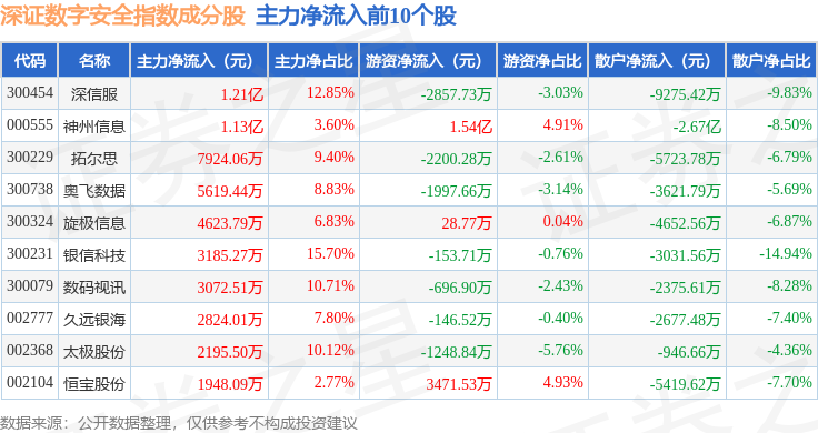 资金流向方面,深证数字安全(970052)指数成份股当日主力资金净流入合计1043.91万元,游资资金净流入合计4.4亿元,散户资金净流出合计4.51亿元。成份股资金流向详情见下表: