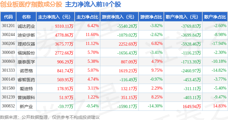资金流向方面,创业板医疗(970082)指数成份股当日主力资金净流出合计5.73亿元,游资资金净流出合计4260.27万元,散户资金净流入合计6.15亿元。成份股资金流向详情见下表: