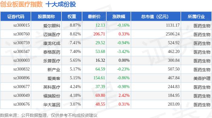 证券之星消息,11月18日,创业板医疗(970082)指数报收于3813.56点,跌0.3%,成交101.85亿元,换手率1.37%。当日该指数成份股中,上涨的有11家,诚达药业以20.01%的涨幅领涨,下跌的有38家,泰格医药以3.42%的跌幅领跌。