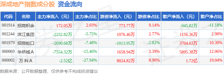 资金流向方面,深成地产(971001)指数成份股当日主力资金净流出合计3.75亿元,游资资金净流入合计1.05亿元,散户资金净流入合计2.7亿元。成份股资金流向详情见下表: