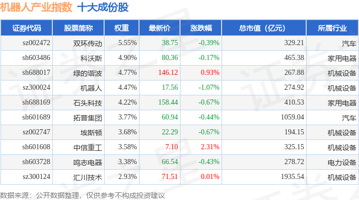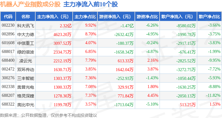 资金流向方面,机器人产业(980022)指数成份股当日主力资金净流出合计5.68亿元,游资资金净流入合计1.8亿元,散户资金净流入合计3.88亿元。成份股资金流向详情见下表: