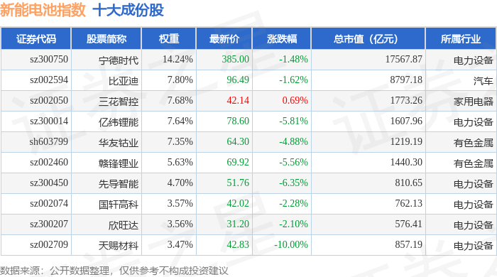 资金流向方面,新能电池(980032)指数成份股当日主力资金净流出合计139.59亿元,游资资金净流入合计43.54亿元,散户资金净流入合计96.06亿元。成份股资金流向详情见下表: