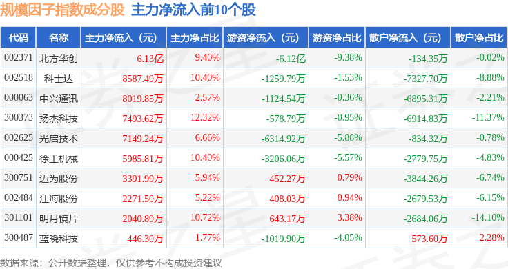资金流向方面,规模因子(980055)指数成份股当日主力资金净流出合计12.31亿元,游资资金净流出合计2.38亿元,散户资金净流入合计14.69亿元。成份股资金流向详情见下表: