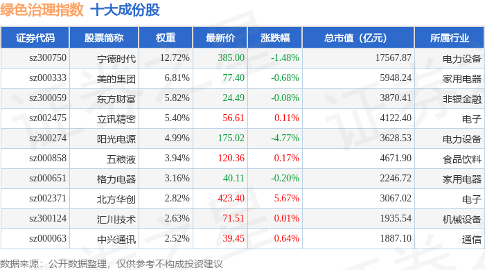 证券之星消息,11月18日,绿色治理(980058)指数报收于1330.49点,跌0.73%,成交1104.23亿元,换手率1.23%。当日该指数成份股中,上涨的有25家,北方华创以5.67%的涨幅领涨,下跌的有74家,立中集团以12.65%的跌幅领跌。
