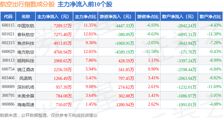 资金流向方面,航空出行(980059)指数成份股当日主力资金净流出合计20.88亿元,游资资金净流入合计9990.59万元,散户资金净流入合计19.88亿元。成份股资金流向详情见下表: