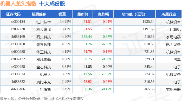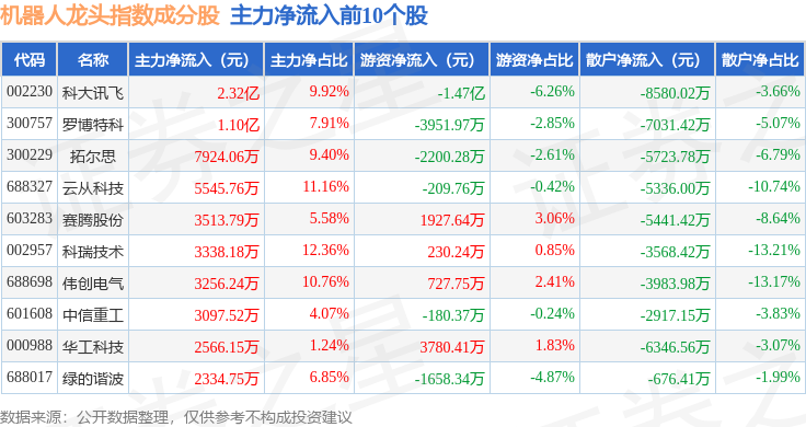 资金流向方面,机器人龙头(980071)指数成份股当日主力资金净流出合计13.97亿元,游资资金净流入合计3.59亿元,散户资金净流入合计10.39亿元。成份股资金流向详情见下表: