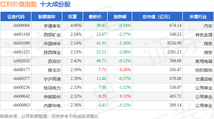 证券之星消息,11月18日,红利价值(980103)指数报收于3246.49点,跌1.02%,成交229.1亿元,换手率0.33%。当日该指数成份股中,上涨的有5家,分众传媒以1.05%的涨幅领涨,下跌的有42家,云天化以4.16%的跌幅领跌。
