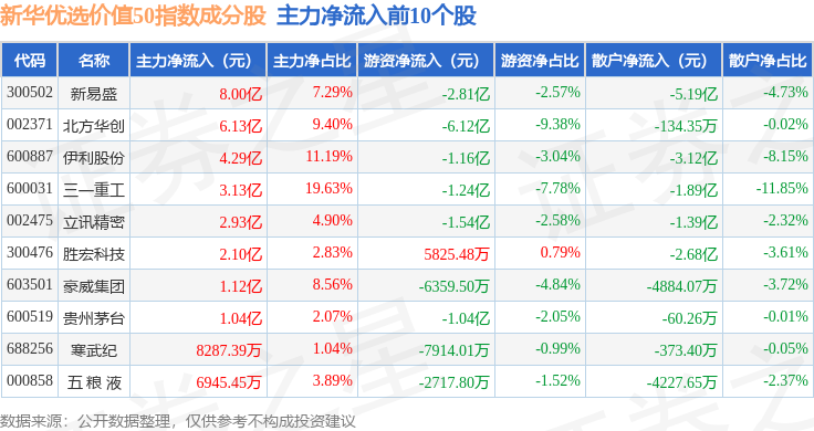 资金流向方面,新华优选价值50(989004)指数成份股当日主力资金净流出合计65.1亿元,游资资金净流入合计11.9亿元,散户资金净流入合计53.2亿元。成份股资金流向详情见下表: