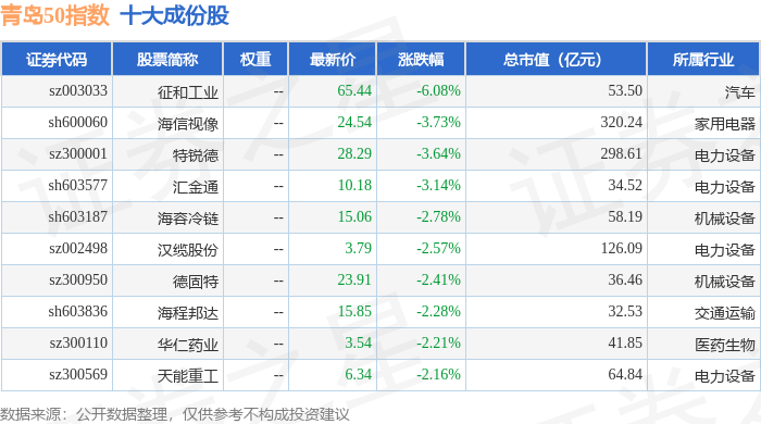 青岛50(989011)指数十大成份股详情如下: