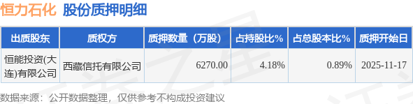 证券之星消息,恒力石化(600346)11月18日公开信息显示,股东恒能投资(大连)有限公司向西藏信托有限公司合计质押6270.0万股,占总股本0.89%。质押详情见下表: