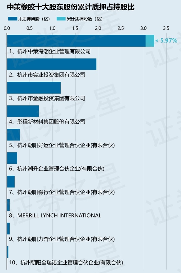 截止本公告日,股东杭州中策海潮企业管理有限公司已累计质押股份1930.0万股,占其持股总数的5.97%。本次质押后中策橡胶十大股东的累计质押股份占持股比例(占持股比例的计算以公司最新一期财务报表公布的十大股东的持股总数为基准)见下图: