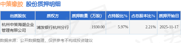 证券之星消息,中策橡胶(603049)11月18日公开信息显示,股东杭州中策海潮企业管理有限公司向浦发银行杭州分行合计质押1930.0万股,占总股本2.21%。质押详情见下表: