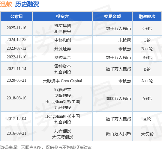 证券之星消息,根据天眼查APP于11月16日公布的信息整理,杭州迅蚁网络科技有限公司C+轮融资,融资额数千万人民币,参与投资的机构包括杭实集团,和信振兴。
