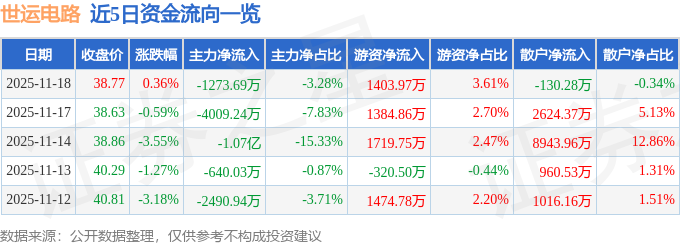 11月18日的资金流向数据方面,主力资金净流出1273.69万元,占总成交额3.28%,游资资金净流入1403.97万元,占总成交额3.61%,散户资金净流出130.28万元,占总成交额0.34%。