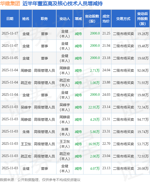 华建集团近半年内的董监高及核心技术人员增减持详情如下: