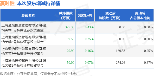 证券之星消息,11月18日赢时胜发布公告《赢时胜:关于持股5%以上股东的一致行动人减持计划实施完成及权益变动触及1%整数倍的公告》,其股东上海通怡投资管理有限公司-通怡芙蓉8号私募证券投资基金、上海通怡投资管理有限公司-通怡芙蓉5号私募证券投资基金、上海通怡投资管理有限公司-通怡芙蓉2号私募证券投资基金于2025年10月23日至2025年11月17日间合计减持685.79万股,占公司目前总股本的0.9132%,变动期间该股股价下跌9.68%,截止11月17日收盘报18.19元。