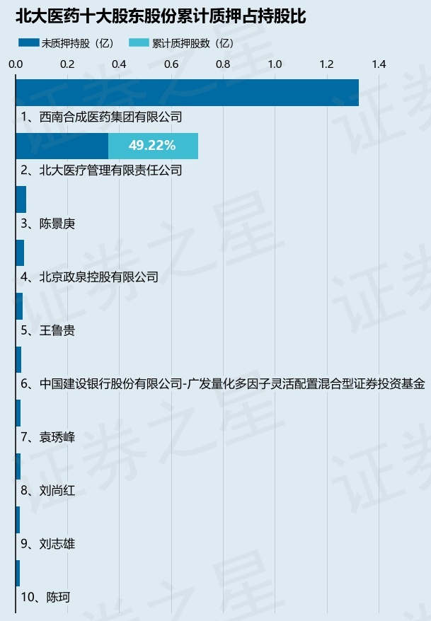 截止本公告日,股东北大医疗管理有限责任公司已累计质押股份3461.54万股,占其持股总数的49.22%。本次质押后北大医药十大股东的累计质押股份占持股比例(占持股比例的计算以公司最新一期财务报表公布的十大股东的持股总数为基准)见下图: