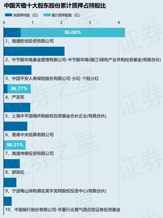 截止本公告日,股东南通乾创投资有限公司已累计质押股份3.63亿股,占其持股总数的86.08%,股东严圣军已累计质押股份8148.0万股,占其持股总数的86.77%,股东南通坤德投资有限公司已累计质押股份7400.0万股,占其持股总数的98.21%。本次质押后中国天楹十大股东的累计质押股份占持股比例(占持股比例的计算以公司最新一期财务报表公布的十大股东的持股总数为基准)见下图: