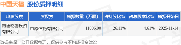 证券之星消息,中国天楹(000035)11月19日公开信息显示,股东南通乾创投资有限公司向中原信托有限公司合计质押1.1亿股,占总股本4.61%。质押详情见下表: