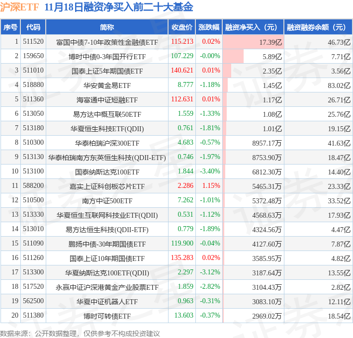 沪深ETF融资净买入前三分别为:富国中债7-10年政策性金融债ETF(511520)融资净买入17.39亿元、博时中债0-3年国开行ETF(159650)融资净买入5.89亿元、国泰上证5年期国债ETF(511010)融资净买入2.35亿元,前20具体见下表: